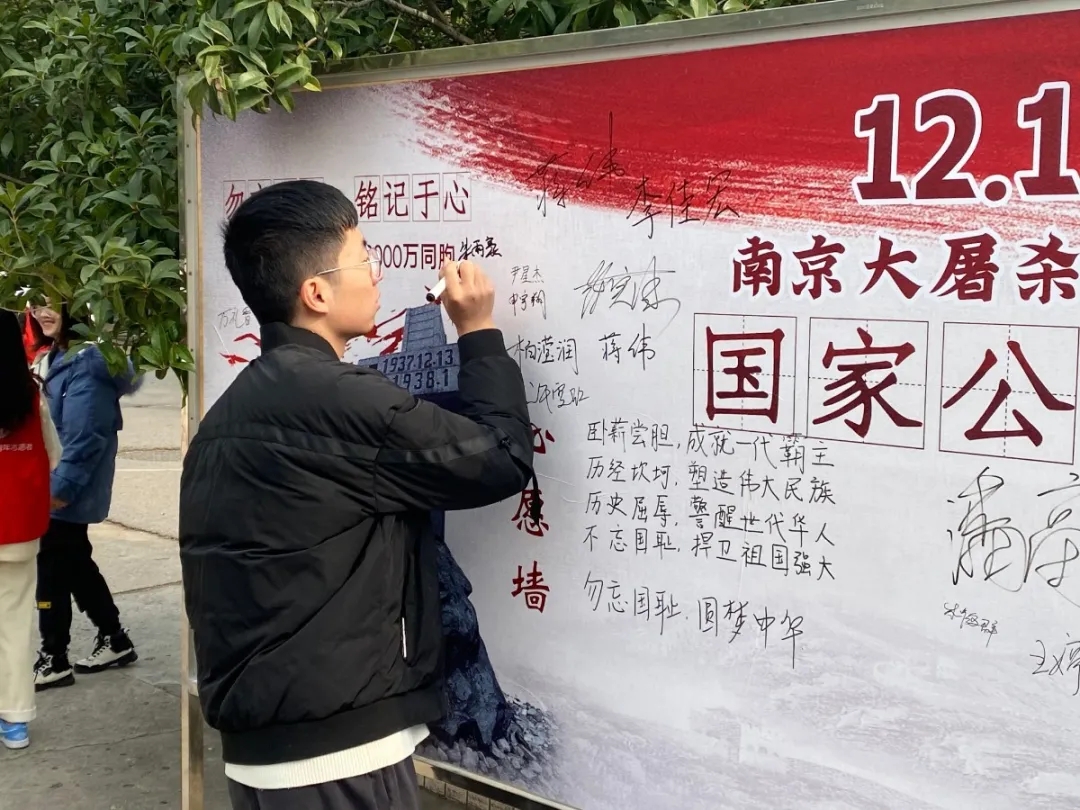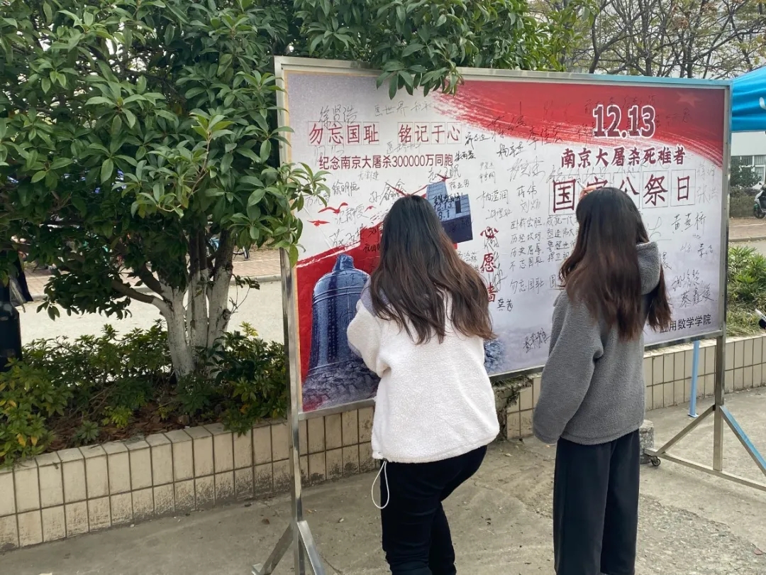 学生会在中苑外场举办了“和平许愿墙”签名悼念活动。在此次活动中,所有海报都以暗色调为主,展示了活动的庄严。很多准备去食堂就餐的同学停下脚步,在展板上签上自己的名字,表达对南京大屠杀死难者的祈福以及对世界和平的美好愿望。活动结束后,AG亚游