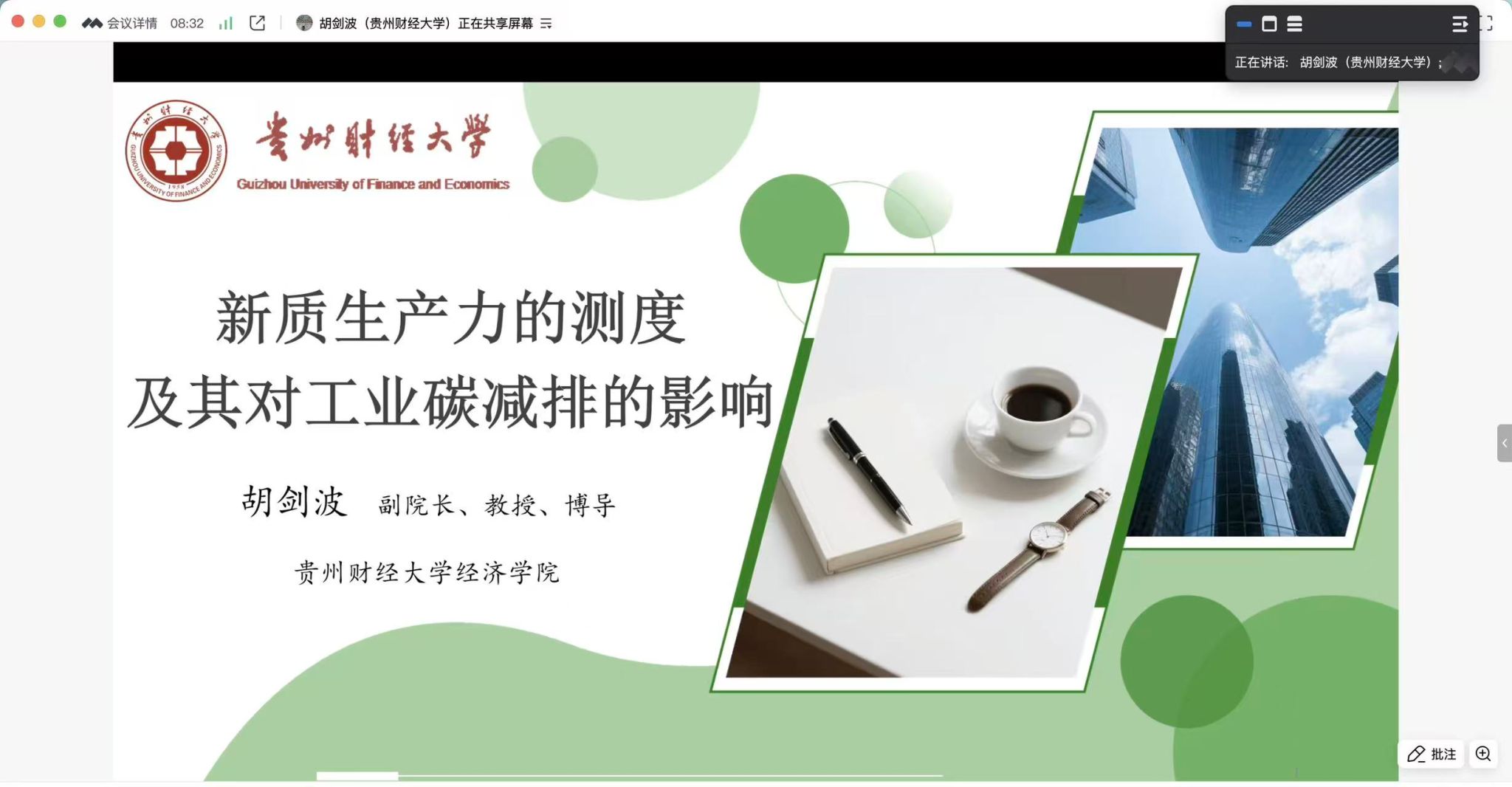 副院长胡剑波教授为师生做了题为“新质生产力的测度及其对工业碳减排的影响”的线上学术报告会,报告由AG亚游