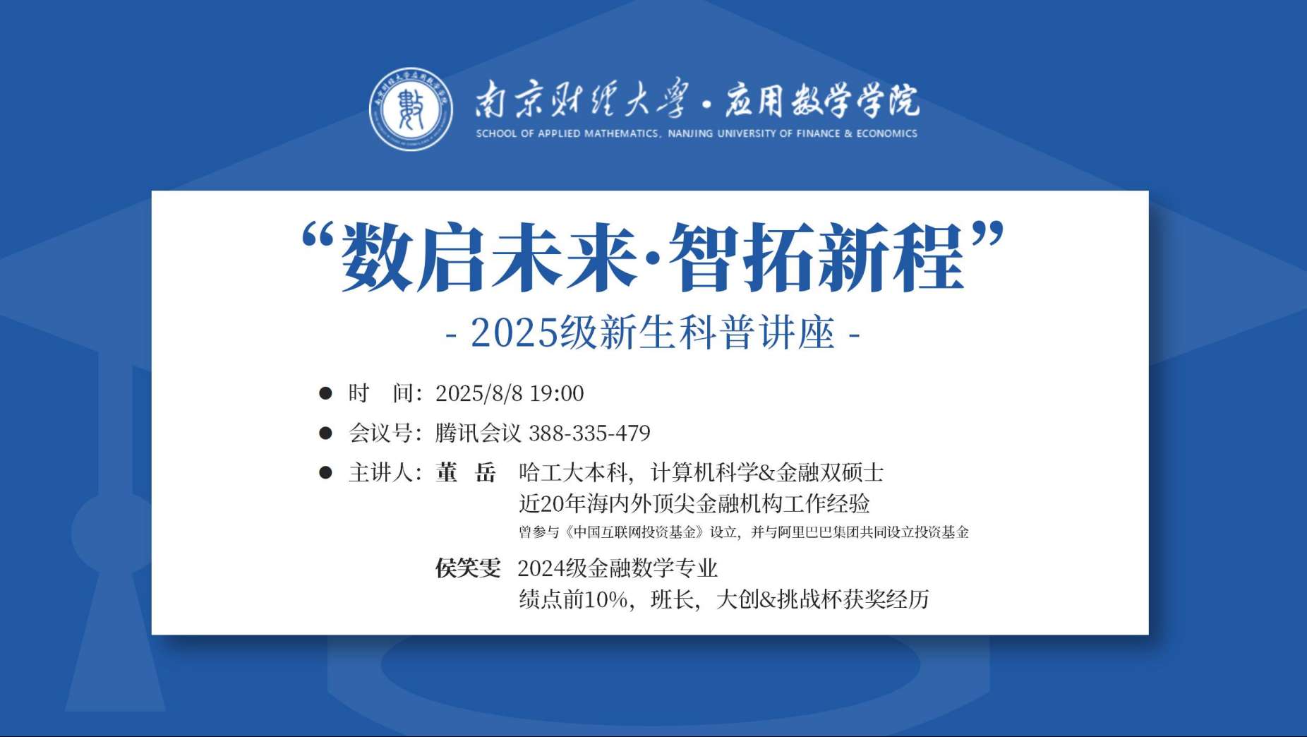 于8月8日晚举办“数启未来·智拓新程:数学学科的成长坐标系与破界新路径”专题讲座,特邀资深金融从业背景的董岳老师及2024级优秀学生代表侯笑雯担任主讲,2025级新生参加活动。