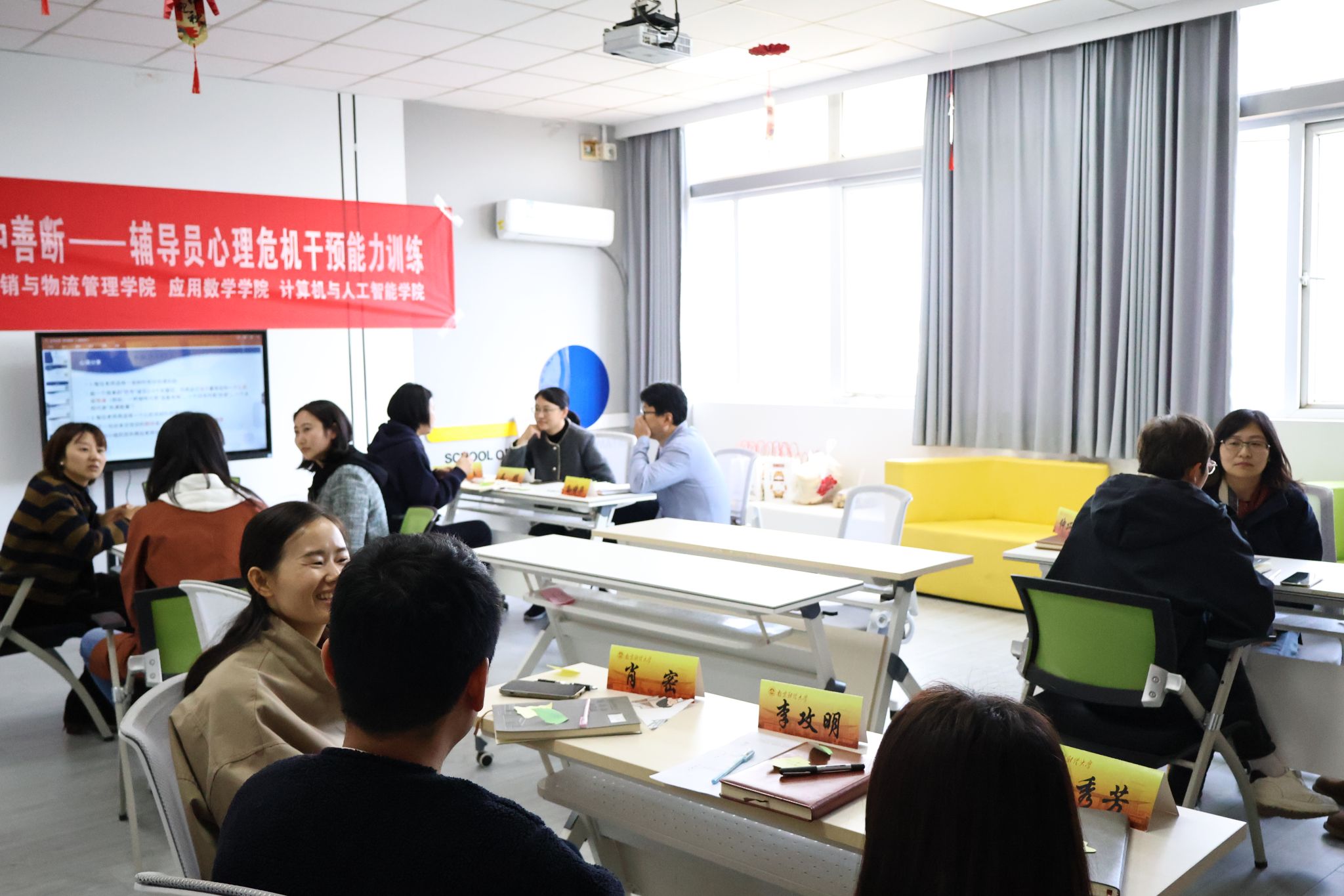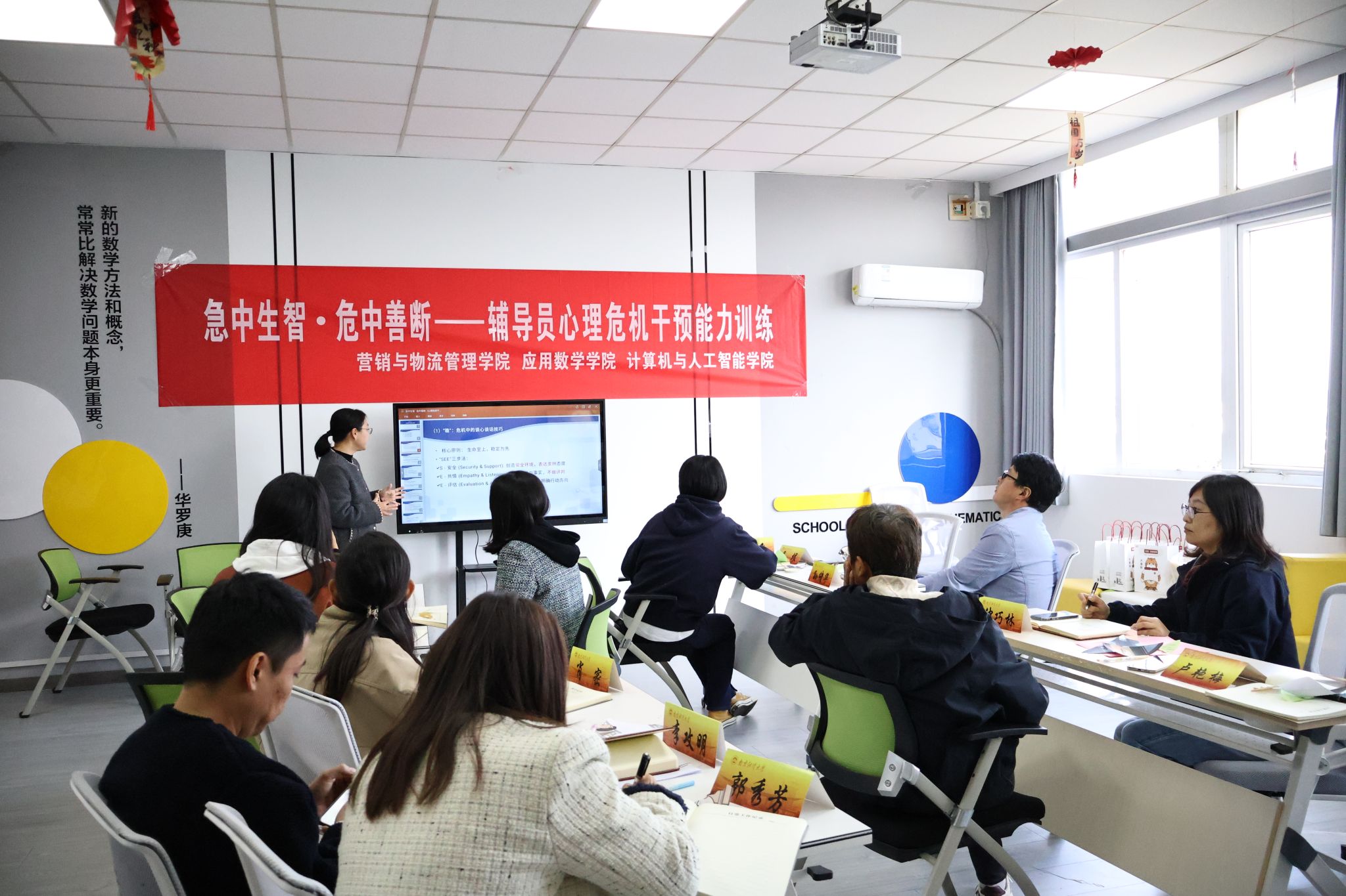 活动开场,破冰分组环节有效帮助辅导员老师打破院系的界限,快速组成了新团队。紧接着的心语分享环节,大家借助便利贴表达当下心态与对活动的期待,在轻松开放的交流氛围中拉近了彼此的距离。随后进入模拟演练阶段,4个小组围绕“学生学业压力疏导”“人际交往矛盾调解”“情绪危机初步干预”等常见场景展开。辅导员们分别扮演学生与干预者,全身心投入,沉浸式还原真实工作场景。在演练过程中,大家打磨沟通话术与干预技巧,力求做到精准有效。