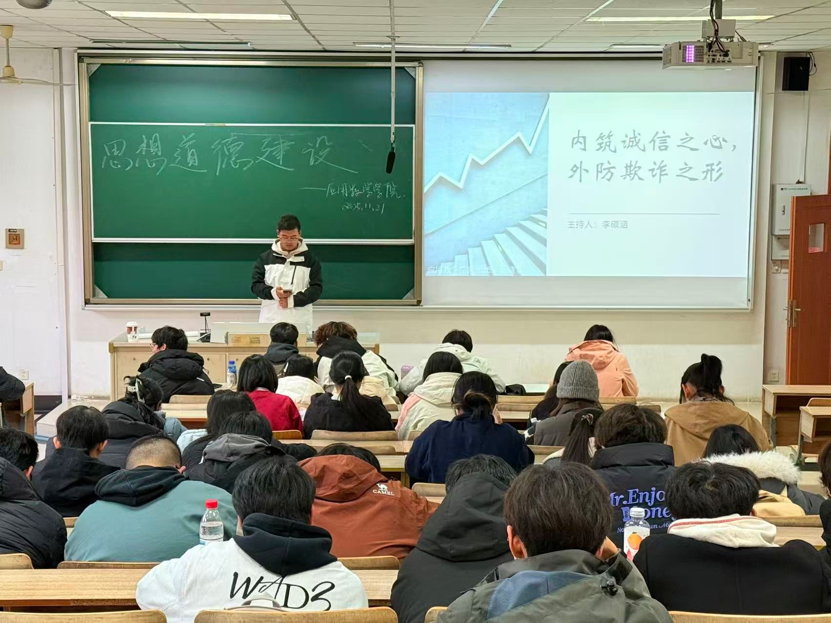 学生会于11月21日在仙林校区博远楼108教室举办以“内筑诚信之心,外防欺诈之形”为主题的思想道德建设活动。活动由志愿者李硕涵主持,综合事务中心负责人以及全体志愿者参加,活动通过案例讲解、情景演绎、互动问答等多元形式,全方位普及反诈知识,提升学生的风险防范能力。